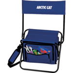 The Folding Insulated 12-Can Cooler Chair has PEVA insulation and a durable metal frame with a padded seat. It features a zippered main compartment, zippered front pocket, two back mesh drawstring pockets and a detachable, adjustable padded shoulder strap. It's also collapsible for easy storage.