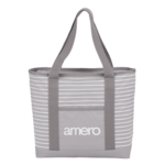 The Saturn Zippered Business tote is a striped tote that has a large zippered main compartment. The front slash pocket adds extra storage. This tote features double handles with a 10” handle drop.