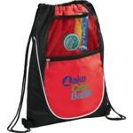 The Locker Mesh Pocket Drawstring Bag has an open main compartment with a zippered front pocket and a cinching rope closure.