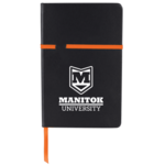 The 5" x 8" Prima Notebook is a hard cover bound notebook with 80 sheets of cream lined paper. Features an elastic strap on front cover designed to securly hold a pen and smartphone. Color matching elastic closure and ribbon page marker.