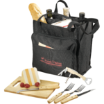 Showcase this picnic set when entertaining clients outdoors. 7-piece set includes a wine opener, two stainless steel knives and forks with polished wood handles, a polished wood cutting board, zippered canvas wrap and canvas tote that holds three bottles of wine. Durable straps for easy carry.